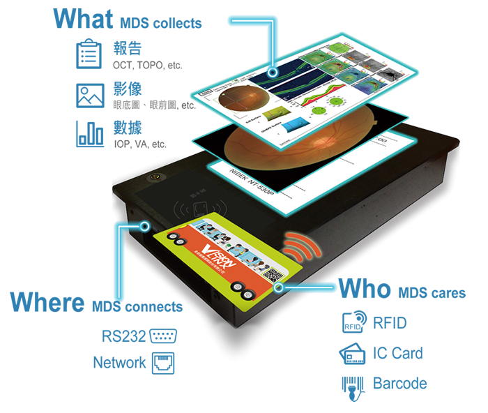 MDS連接了閱圖系統和歷史數據檢視系統兩大系統,以呈現多面向的病患資訊。有助於醫師觀測病患長期的眼部變化。